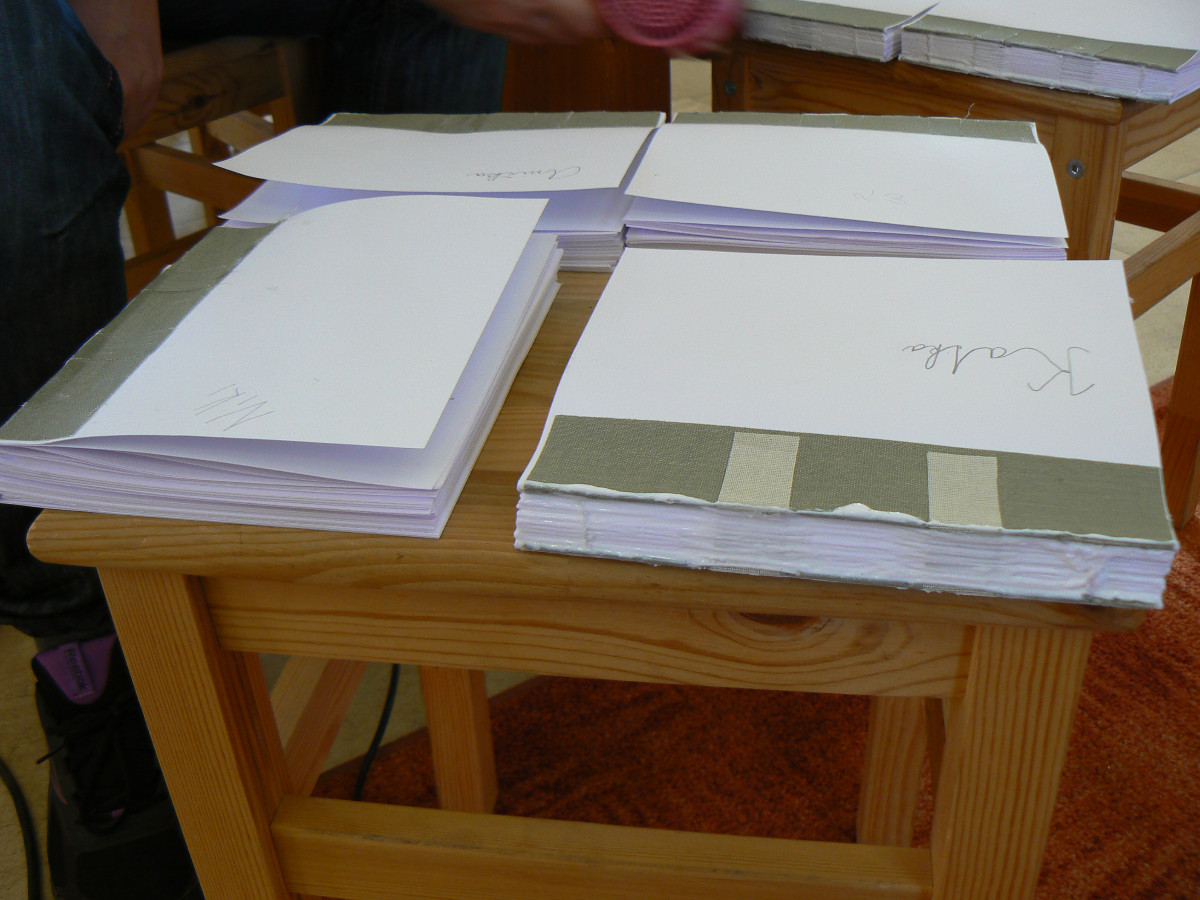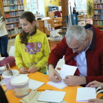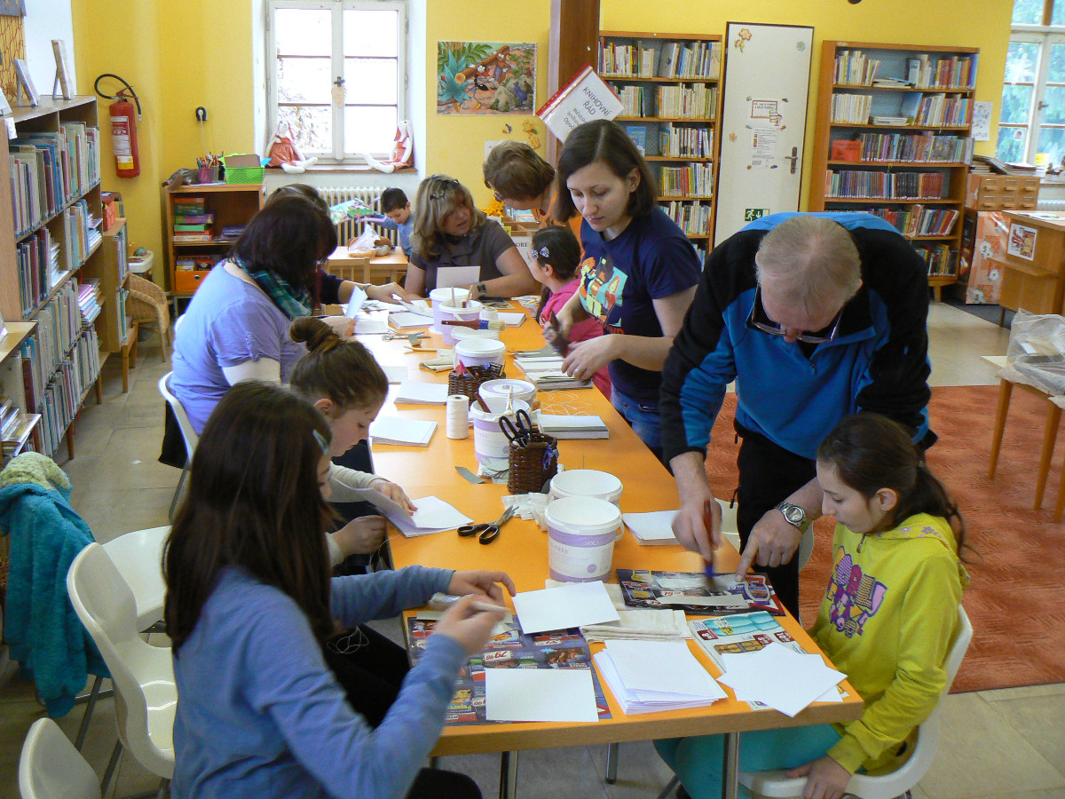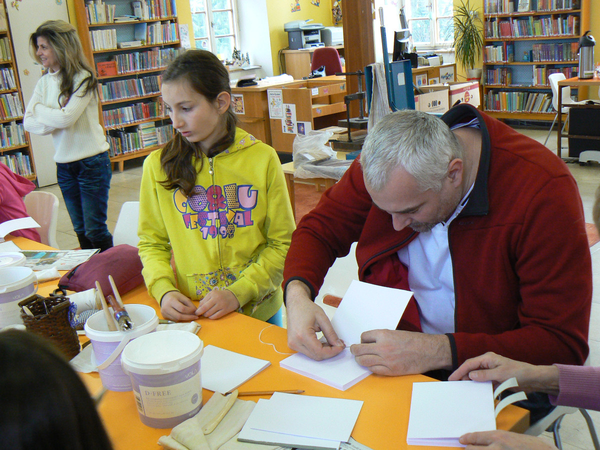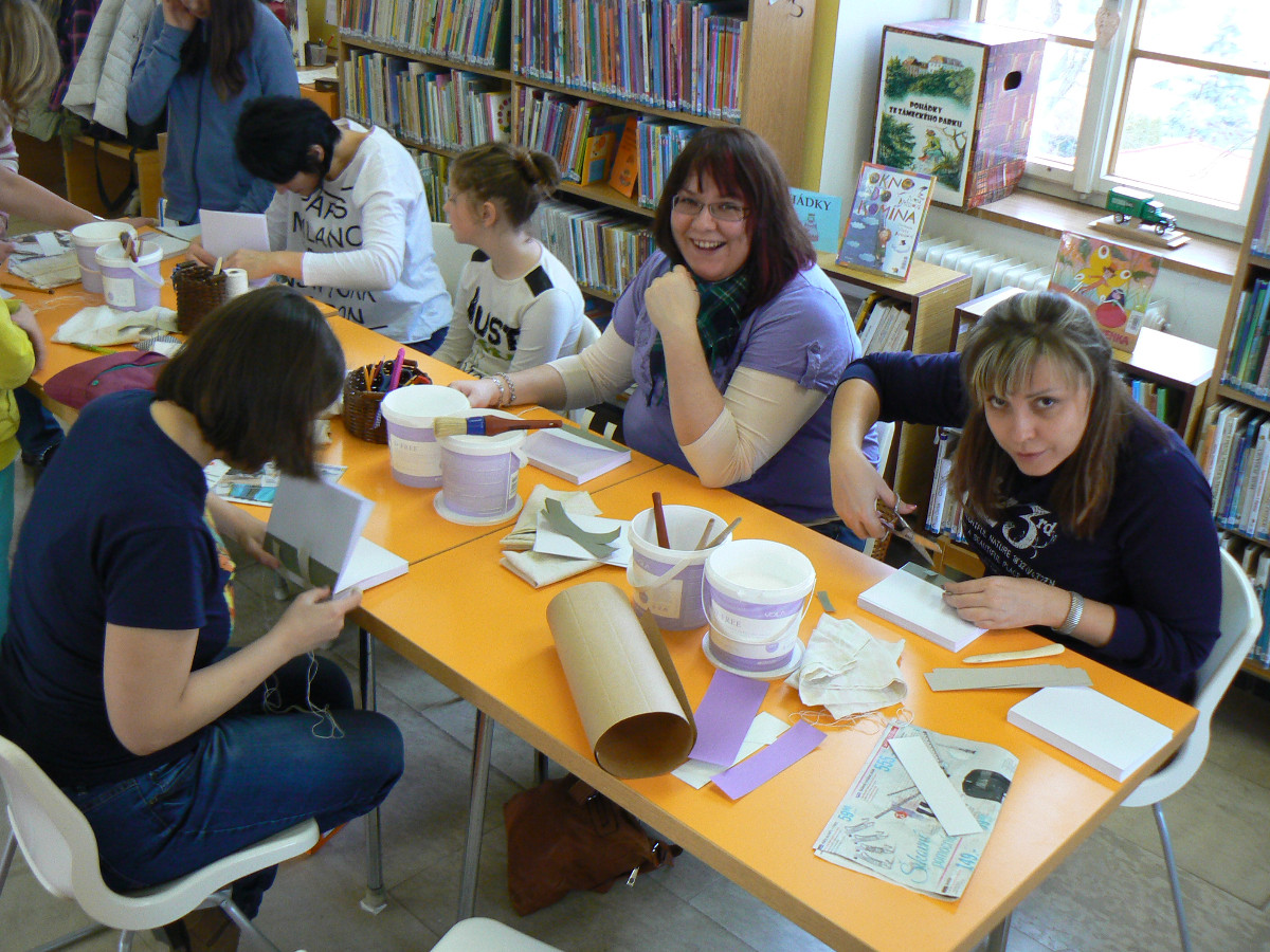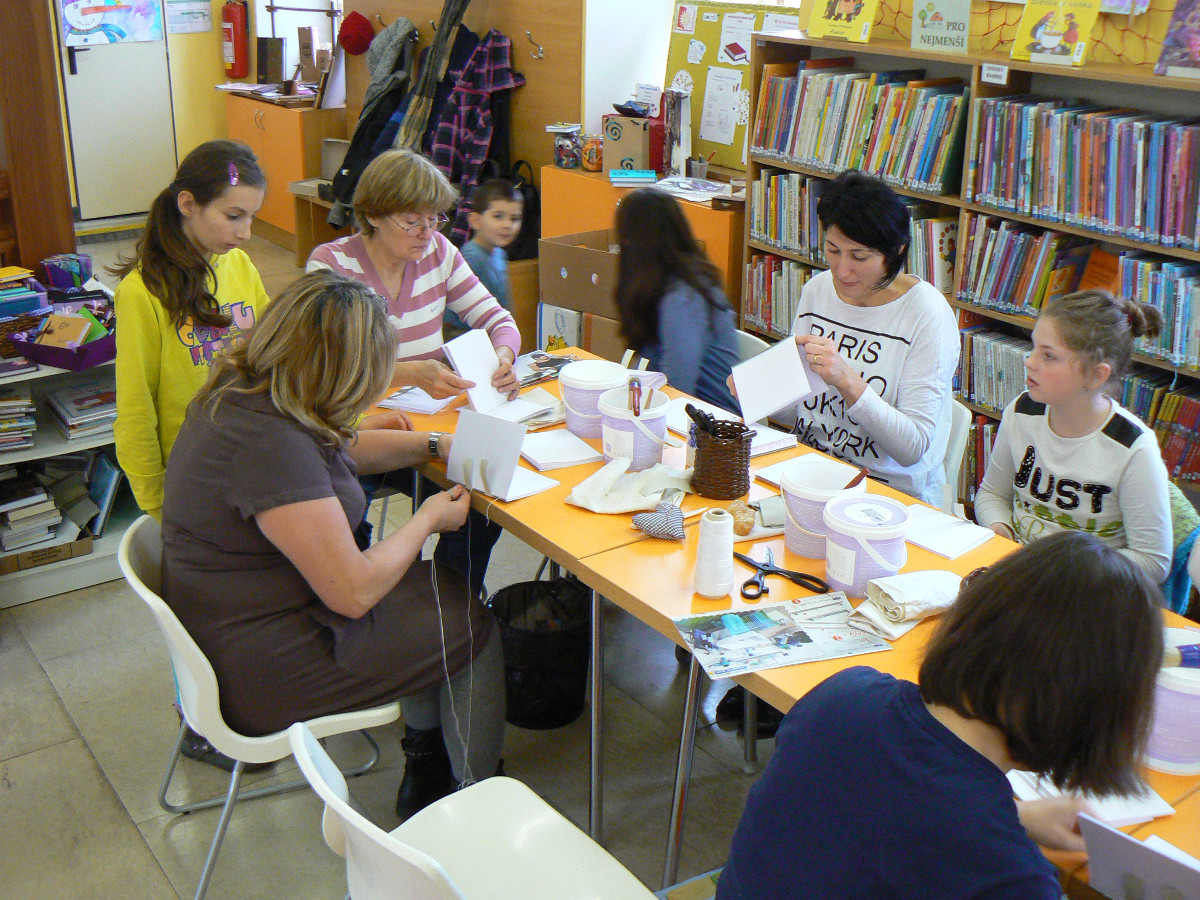 Knihařská dílna 6. 2. 2016 Knihovna Opočno 6.2.2016 Knihařská dílna 6. 2. 20162016-02-11T07:57:08+00:00 2016 Vše připraveno a můžeme začít! Už se činíme… … a činíme. Lepíme… … šijeme (ano, zapojila se i mužská část)… … a hodně se při tom smějeme 🙂 Enkaustika s panem Vytečkou. Knihy před ořezem a zavěšením do desek. Výsledek našeho snažení!