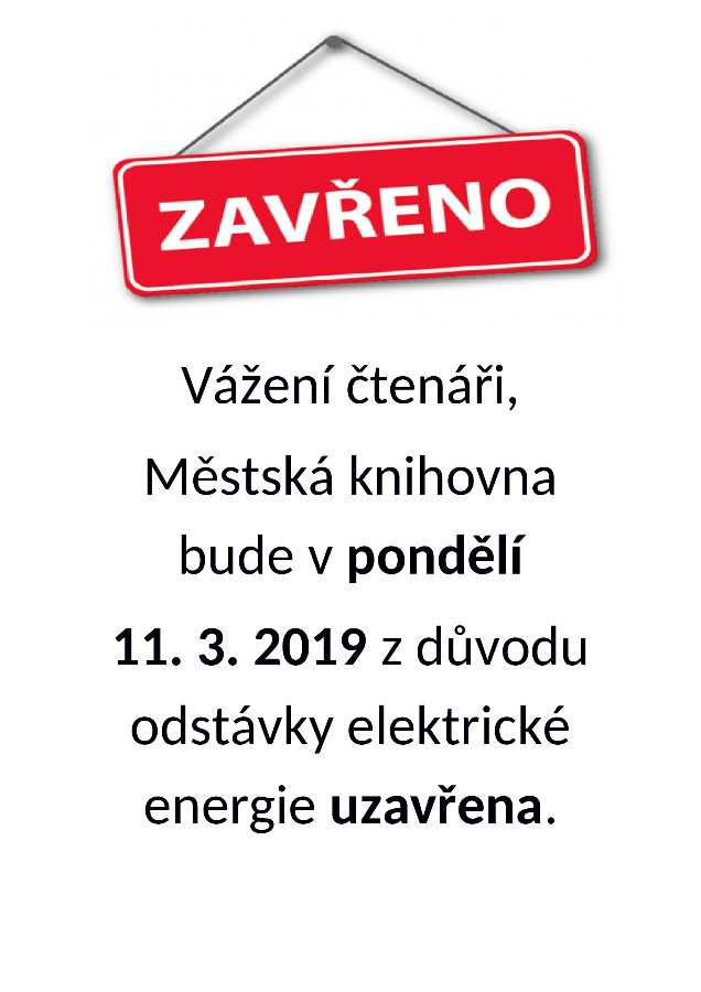 Uzavření knihovny 11.3.2019 Knihovna Opočno 2.3.2019 Uzavření knihovny 11.3.20192019-03-02T09:14:22+00:00 Dětské oddělení, Oddělení pro dospělé, Zprávy V pondělí 11. března bude z důvodu přerušení dodávky elektrické energie uzavřena knihovna. Děkujeme za pochopení.
