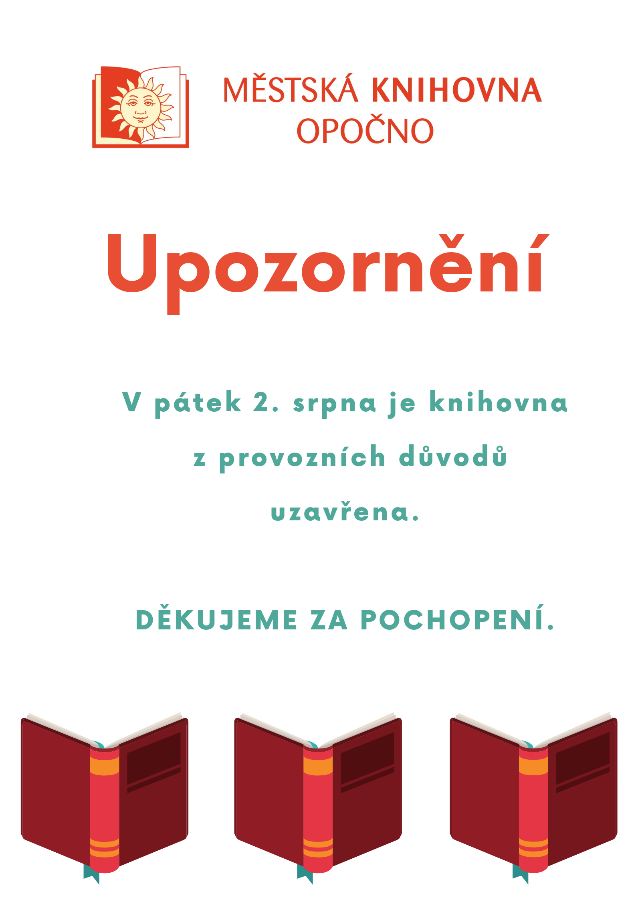 Upozornění na uzavření knihovny Knihovna Opočno 26.7.2019 Upozornění na uzavření knihovny2019-07-26T06:34:24+00:00 Dětské oddělení, Oddělení pro dospělé, Zprávy Vážení návštěvníci knihovny, upozorňujeme Vás, že v pátek 2. srpna bude knihovna z provozních důvodů uzavřena. Předem děkujeme za pochopení a budeme se na Vás těšit opět v pondělí 5. srpna.