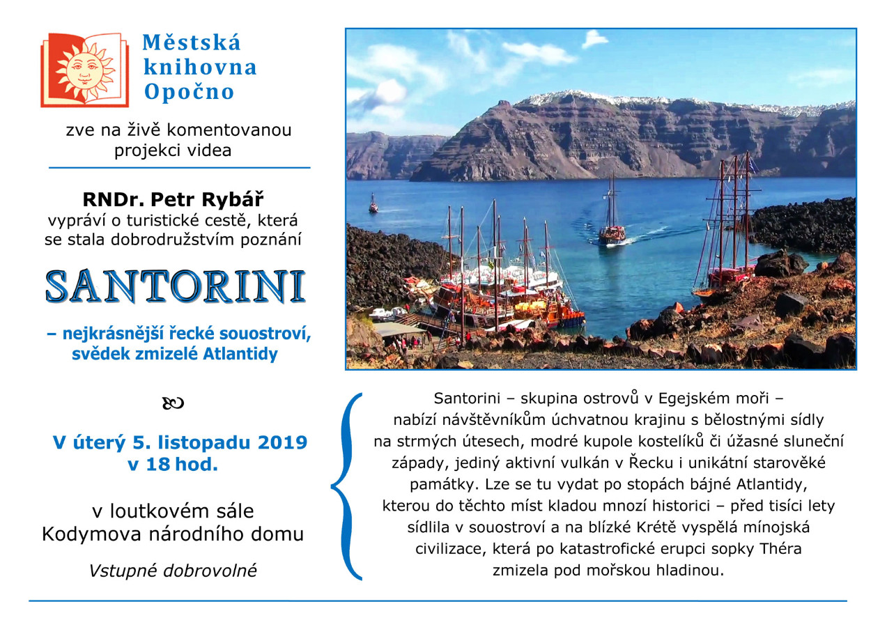 Santorini – nejkrásnější řecké souostroví Knihovna Opočno 10.10.2019 Santorini – nejkrásnější řecké souostroví2019-10-10T08:43:10+00:00 Slider obrázky úterý 5. listopadu od 18 hod v Kodymově národním domě santorini