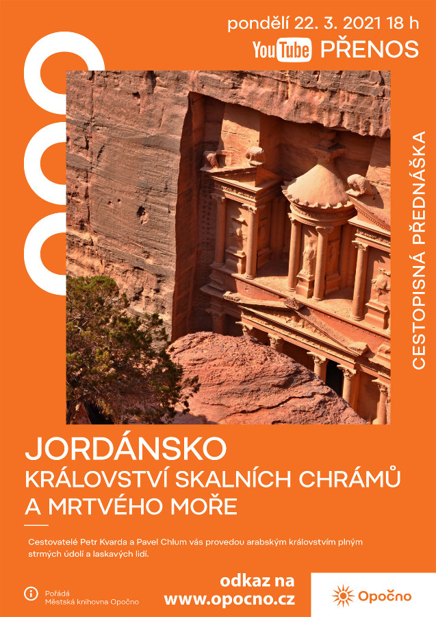 Milí návštěvníci cestopisných přednášek, jelikož se stále nemůžeme setkávat osobně, rozhodli jsme se zprostředkovat Vám cestovatelský zážitek alespoň prostřednictvím online přenosu. Ten budete moci sledovat na youtube kanále města Opočna přes odkaz na stránkách města www.opocno.cz dne 22. 3. 2021 od 18 hodin. Můžete se těšit na cestovatele Pavla Chluma a Petra Kvardu, kteří Vám budou vyprávět o své cestě do Jordánka. Cestopis bude možno shlédnout i ze záznamu do 22. 5. 2021. Věříme, že to pro Vás bude příjemným zpestřením.