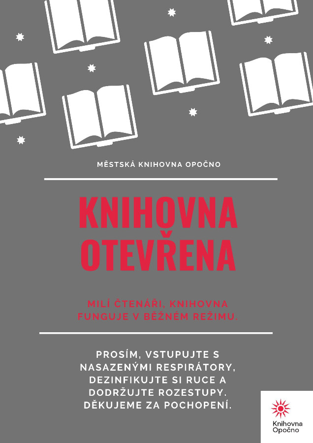 Milí čtenáři, jsme moc rády, že se konečně budeme moci potkat osobně v prostorách knihovny. Od pondělí 12. dubna máme již knihovnu otevřenou v běžném režimu. Budete moci vracet knihy a především si je vybírat sami. Stále však platí protiepidemiologická pravidla. Při příchodu do knihovny mějte nasazený respirátor, u vstupu na půjčovnu si vydezinfikujte ruce a dodržujte rozestupy. Pobyt v knihovně omezte na nezbytně nutnou dobu. Provoz internetu pro veřejnost je do odvolání zrušen. Děkujeme za pochopení.