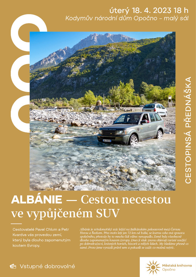 Albánie cestou necestou Knihovna Opočno 14.3.2023 Albánie cestou necestou2023-03-14T08:26:46+00:00 Slider obrázky úterý 18. dubna od 18 hodin v Kodymově národním domě