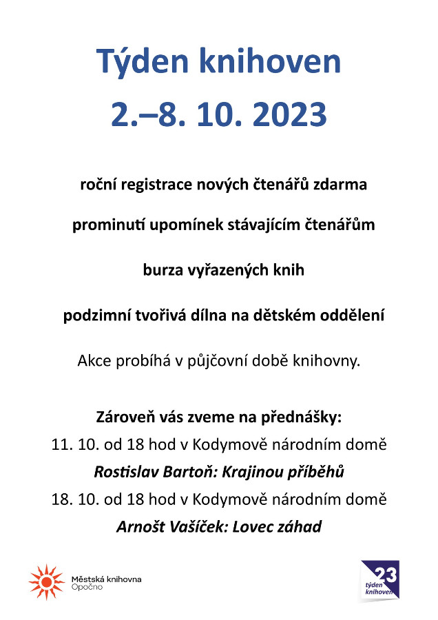 zveme Vás příští týden 2.-6.10. k návštěvě knihovny, kde pro Vás v rámci Týdne knihoven chystáme následující akce: