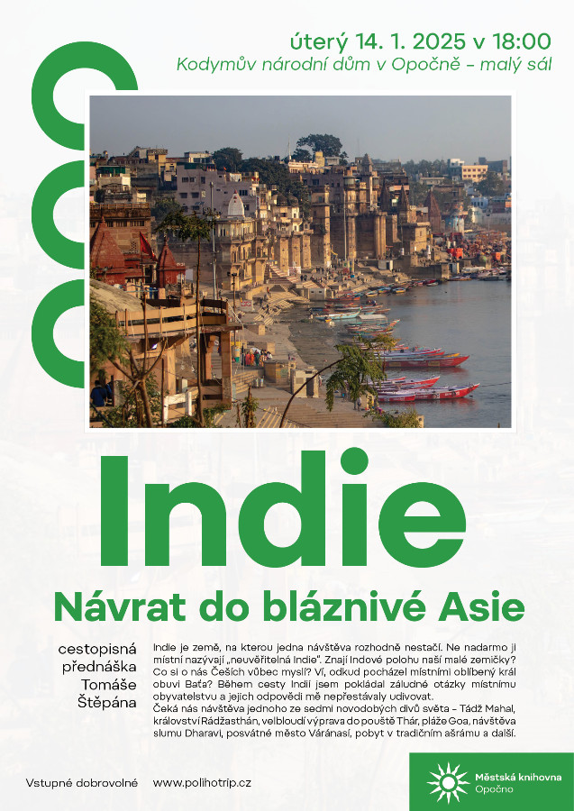Indie – Návrat do bláznivé Asie Knihovna Opočno 6.12.2024 Indie – Návrat do bláznivé Asie2024-12-06T12:25:18+00:00 Slider obrázky cestopisná přednáška úterý 14. ledna 2025 od 18 hodin v malém sále Kodymova národního domu.